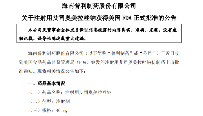 2.注射用艾司奥美拉唑钠获得美国 FDA正式批准;